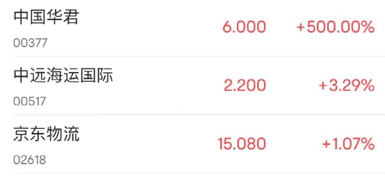 而中国华君所在的港股供应链管理行业板块今日上涨,其中,中国华君涨500%,中远海运国际涨29%,京东物流涨超1%。