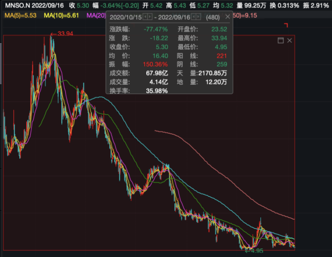 从2020年10月15日至今,名创优品美股下跌近80%。