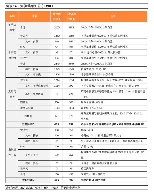 由于欧盟天然气需求具有季节性,因此其天然气库存实际具有跨季保供功能,因此俄罗斯天然气缺口缺口远小于总库存。欧盟冬季天然气需求约为3300TWh,包括俄气在内的全部基础供应约为2800TWh,通常需要额外调用约600TWh的天然气来满足冬季需求。欧盟天然气库存量约为1100TWh,扣除冬季日常使用,俄气正常供应,剩余容量不足500TWh。