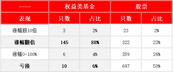 88%的权益类基金翻倍vs23%的股票翻倍