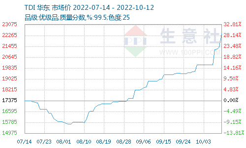 受天然气能源价格大幅上涨影响,今年化工行业的能源和原材料成本大幅增加,导致TDI价格持续上升。由于欧洲的TDI产量超过全球的四分之能源危机影响让欧洲32%的能源司被迫全部或部分减产,这让全球TDI产能和供给都产生了较大下降。欧洲市场中,巴斯夫德国的30万吨TDI装置于4月底停车检修,目前尚未重启;8月10日,欧洲科思创30万吨宣布装路因氯气泄露发生不可抗力,预计11月30日后方可恢复供应。短期看,欧洲TDI产能处于真空状态,这导致TDI价格无法避免的上涨。截至10月12日,TDI基准价已来到22400.00元/吨,较8月初的15000元/吨上涨近50%。